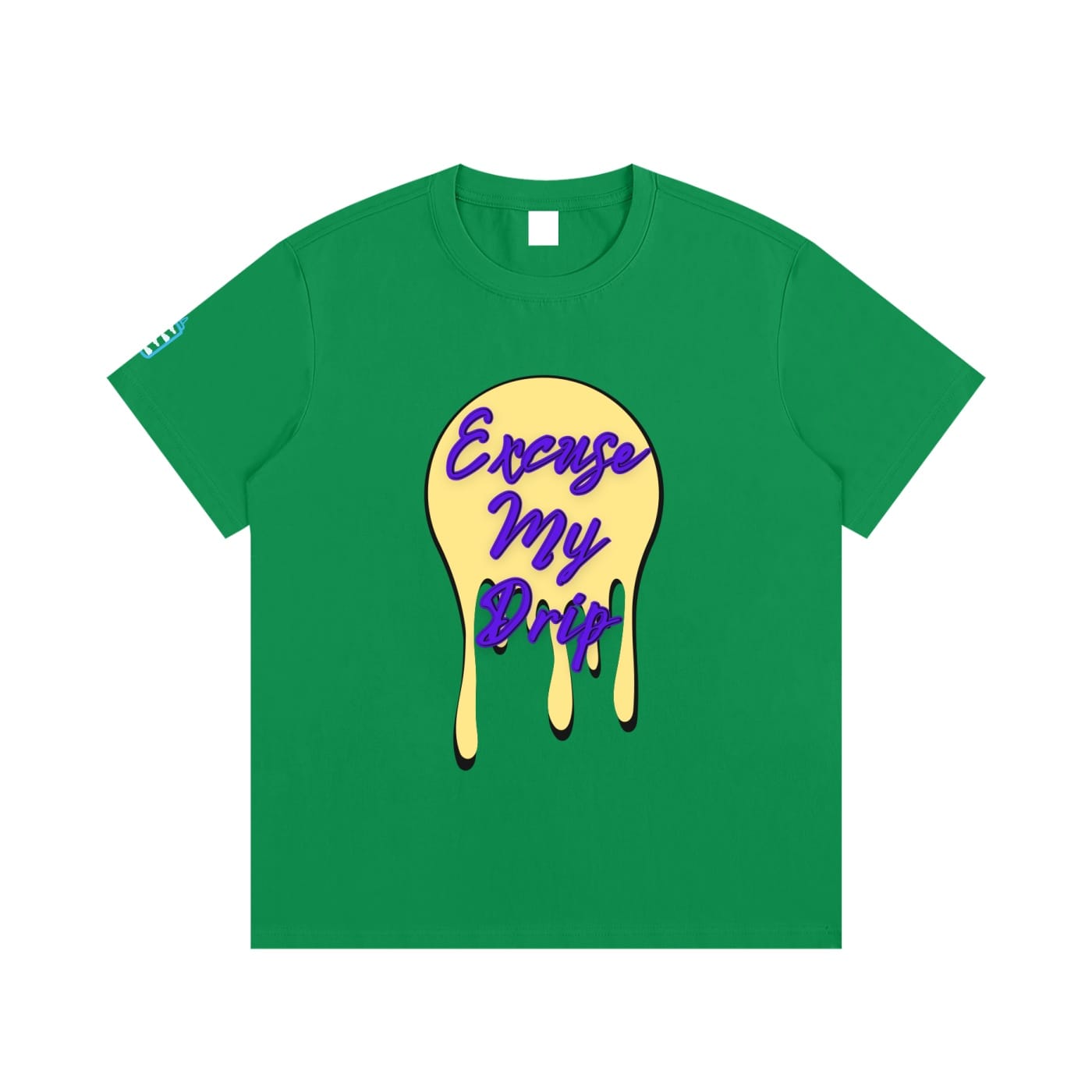 Front and center, the phrase “Excuse My Drip” pops in a smooth green script font, layered over a bright pink dripping circle that adds contrast and attitude. On the right sleeve, you’ll find the subtle flex the signature Sauced Myself blue sauce bottle icon, a nod to the brand’s roots in creativity, confidence, and self-expression.