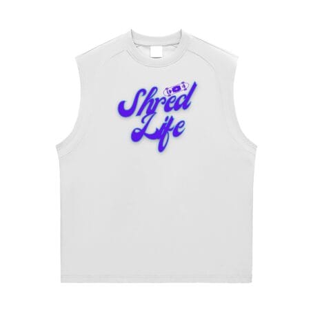 This edition features the “Shred Life” graphic in vibrant purple groovy lettering, backed by a bold turquoise-blue shadow underlay. The color combo creates a crisp, dimensional look that jumps off the clean white fabric perfect for riders who love a bright, expressive style.